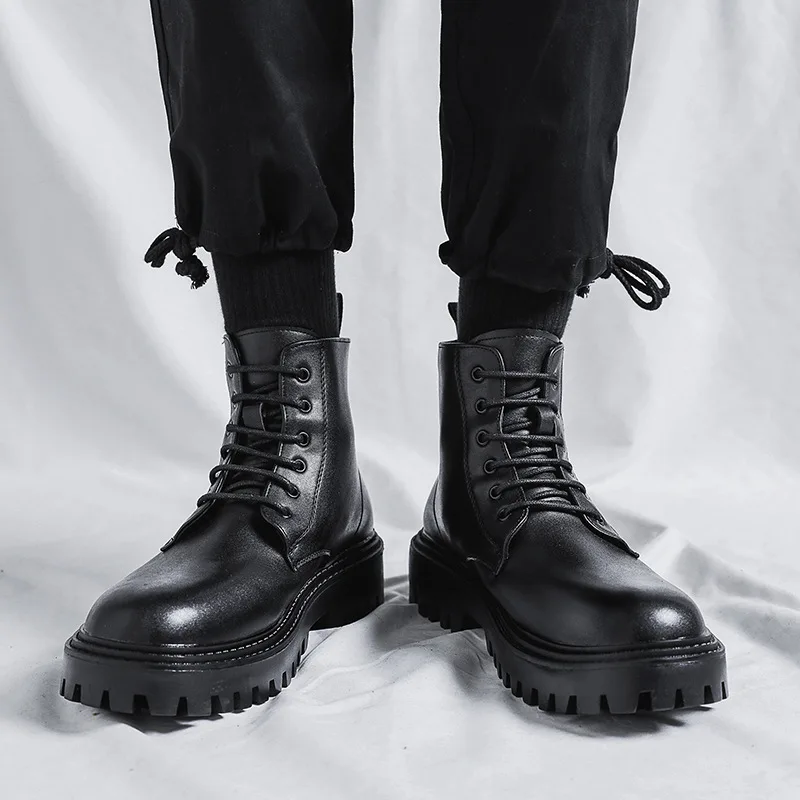 Men's British-Style Leather Boots Versatile Non-Slip Waterproof High Top Thick Sole Height Increasing Simple for Autumn